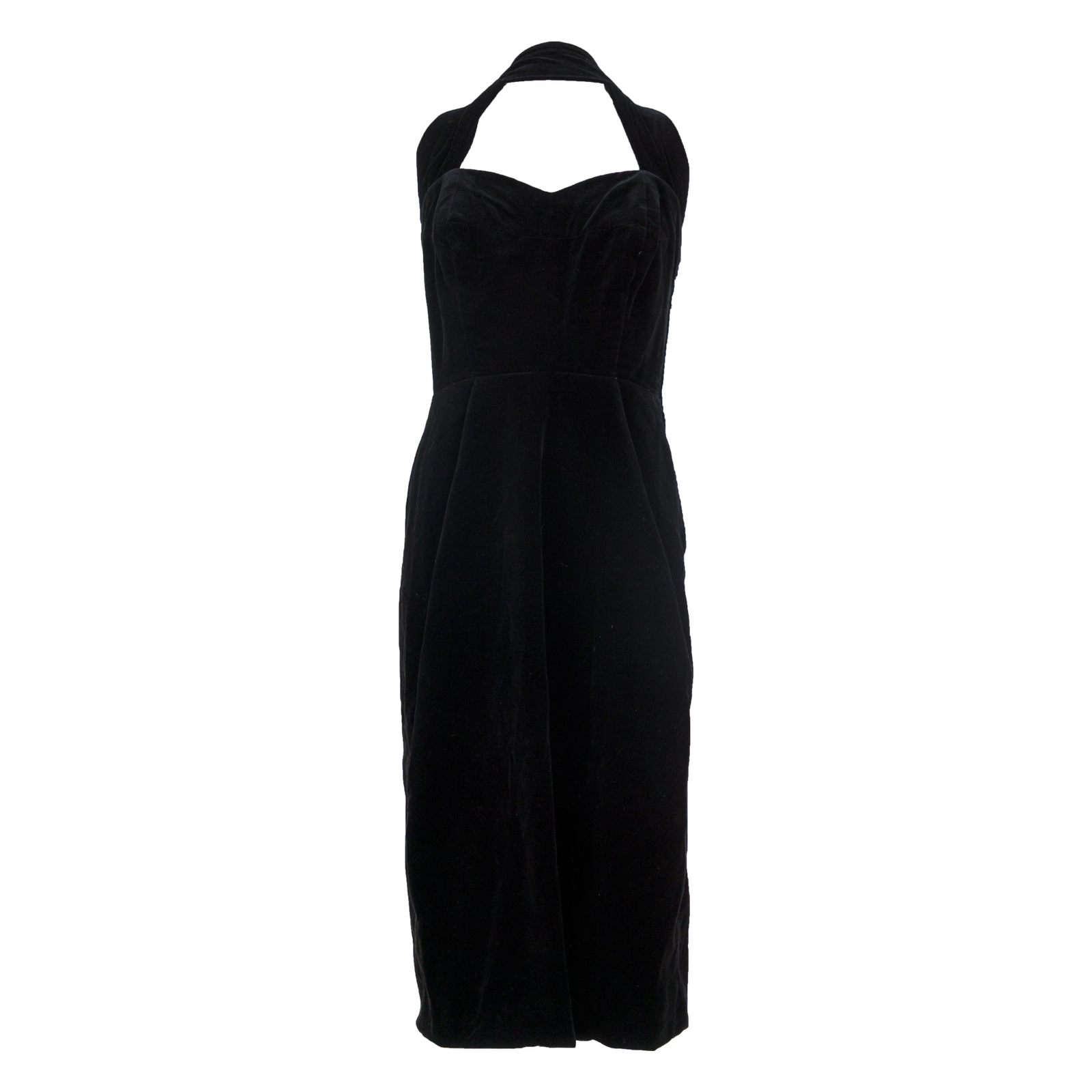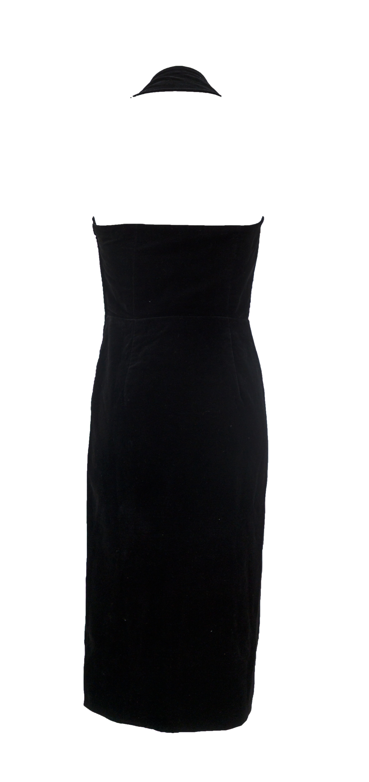 Seconda metà anni ’50/primi ’60, cocktail dress romano in velluto con scollo halter e bustier steccato, realizzato da sartoria “Rica Roma”. Manifattura sartoriale con cintura interna gros‑grain, tele e stecche; zip metallica; fit che scolpisce il busto e segna la vita nel canone anni ’50.