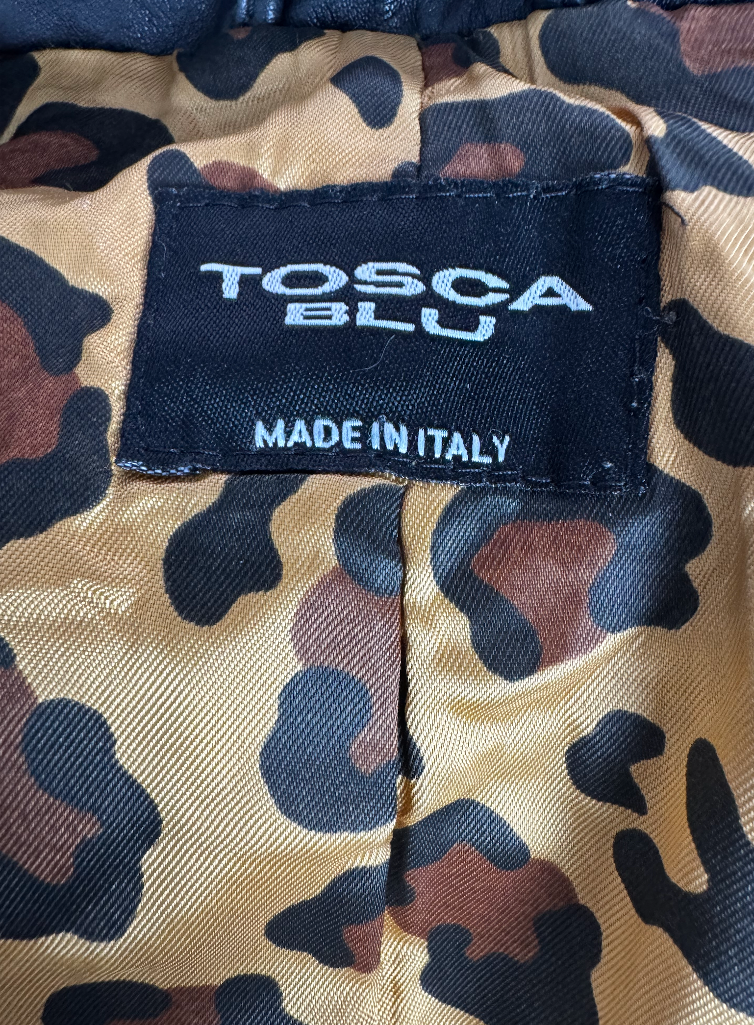 Tosca Blu (marchio specializzato in pelletteria luxury everyday da tracolle a coats), cappotto lungo in pelle nera con zip obliqua diagonale asimmetrica iconica, tasche laterali inserite funzionali, linee geometriche su busto e maniche lunghe slim. Bodycon sopra midi svasata sotto con cuciture a contrasto tono su tono, fit slanciante per serate urbane con stiletto heels o biker stivali, layering collant neri o maglie leggere.