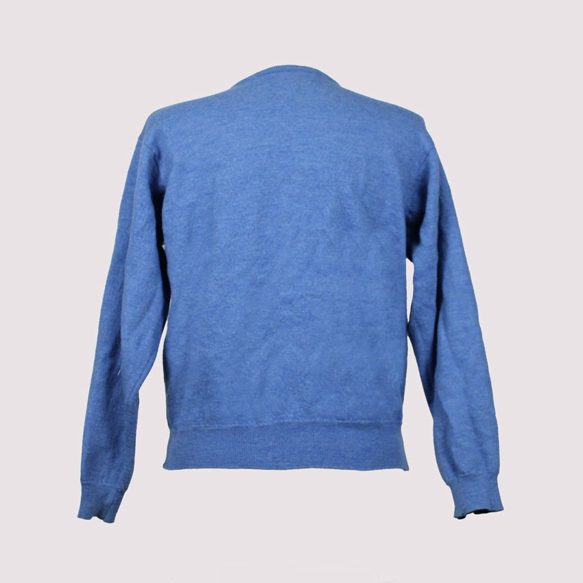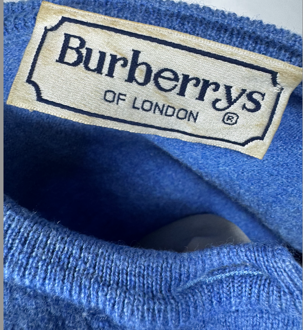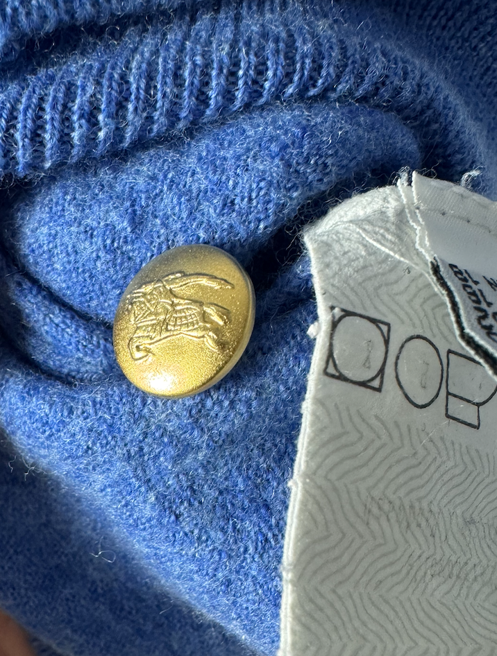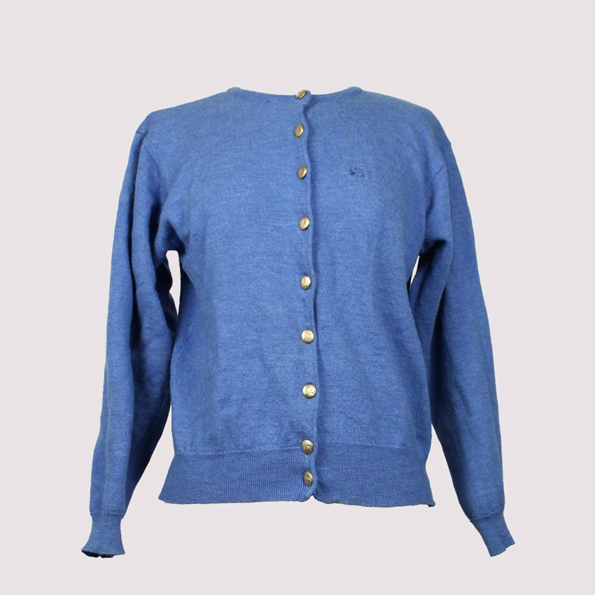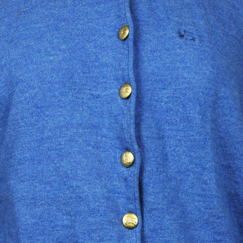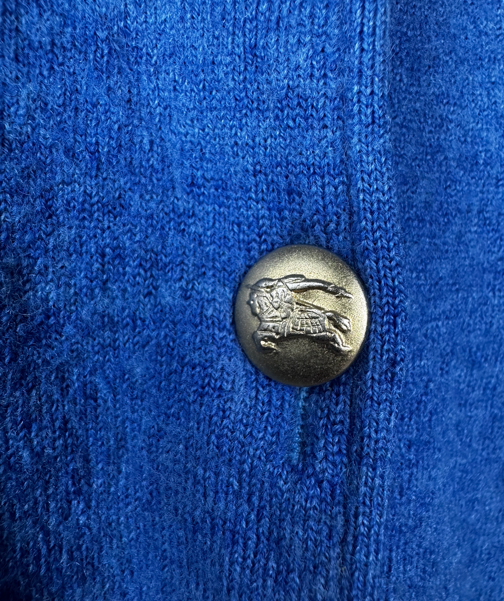 Cardigan Burberry of London celeste in lana fine morbida, con 9 bottoni dorati frontali che portano il Knight equestrian logo signature del brand – quel cavaliere disegnato da Burberry nel 1900s per il trench waterproof, simbolo dell’heritage britannico. Modello crewneck slim con maniche lunghe dritte e orlo a costina elasticizzata in vita che tiene la forma, fit pulito.  Fabbricazione gennaio 1981 in Italia, periodo pre-’90s quando Burberry produceva knitwear italiano per mercati globali, anni ’80 British revival con lana selezionata per mezze stagioni. Abbinabile e midi skirts plissettate, jeans high-waist o pantaloni sartoriali grigi per layering su bluse bianche o camicie oxford, perfetto per autunno o primavera– lavaggio lana a secco specializzato per tenere morbidezza e colore vivo
