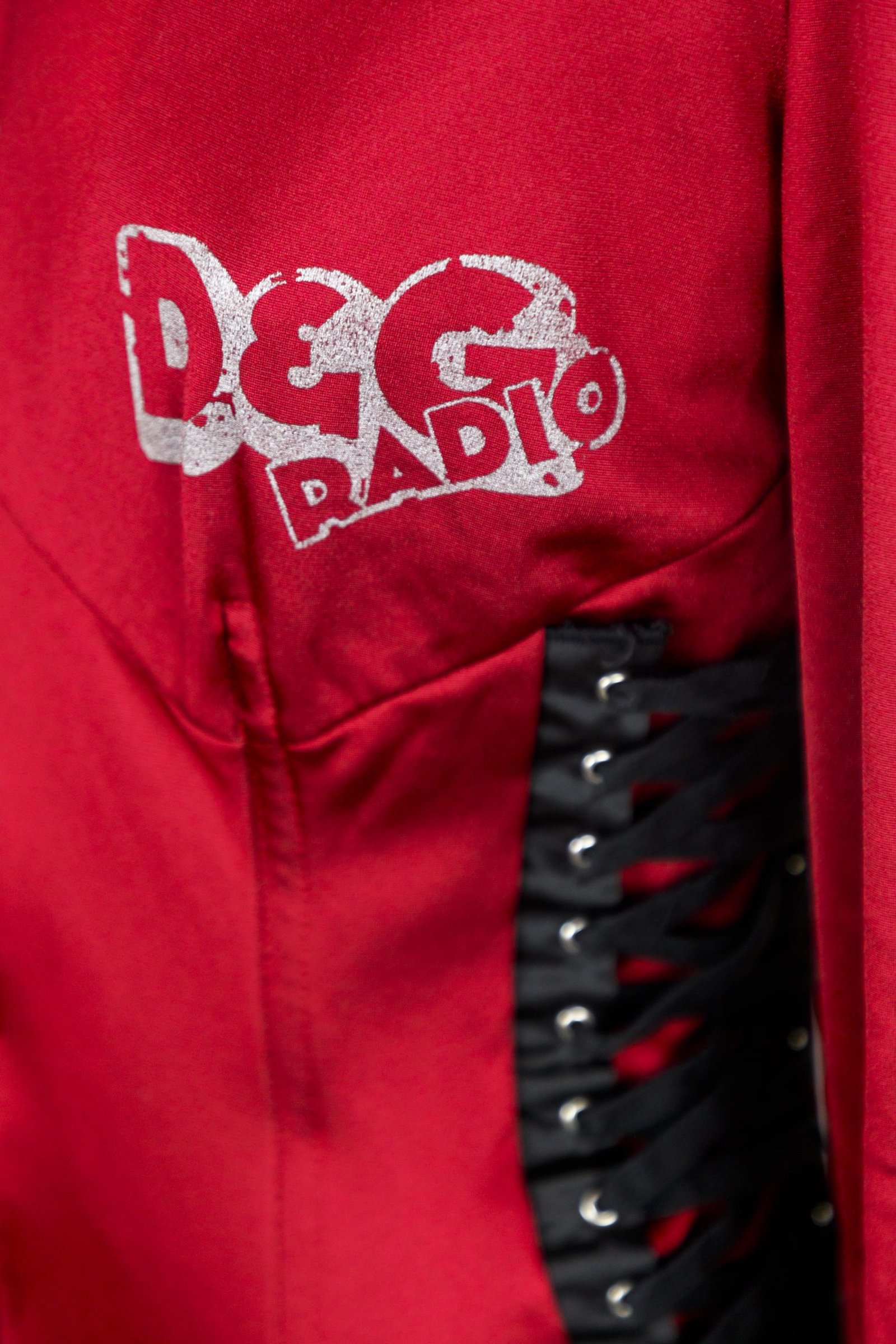 Stampa frontale “D&G Radio” a effetto consumato, polsi e bordi a contrasto scuro; silhouette fitted in pieno spirito sport‑sexy D&G dell’epoca
