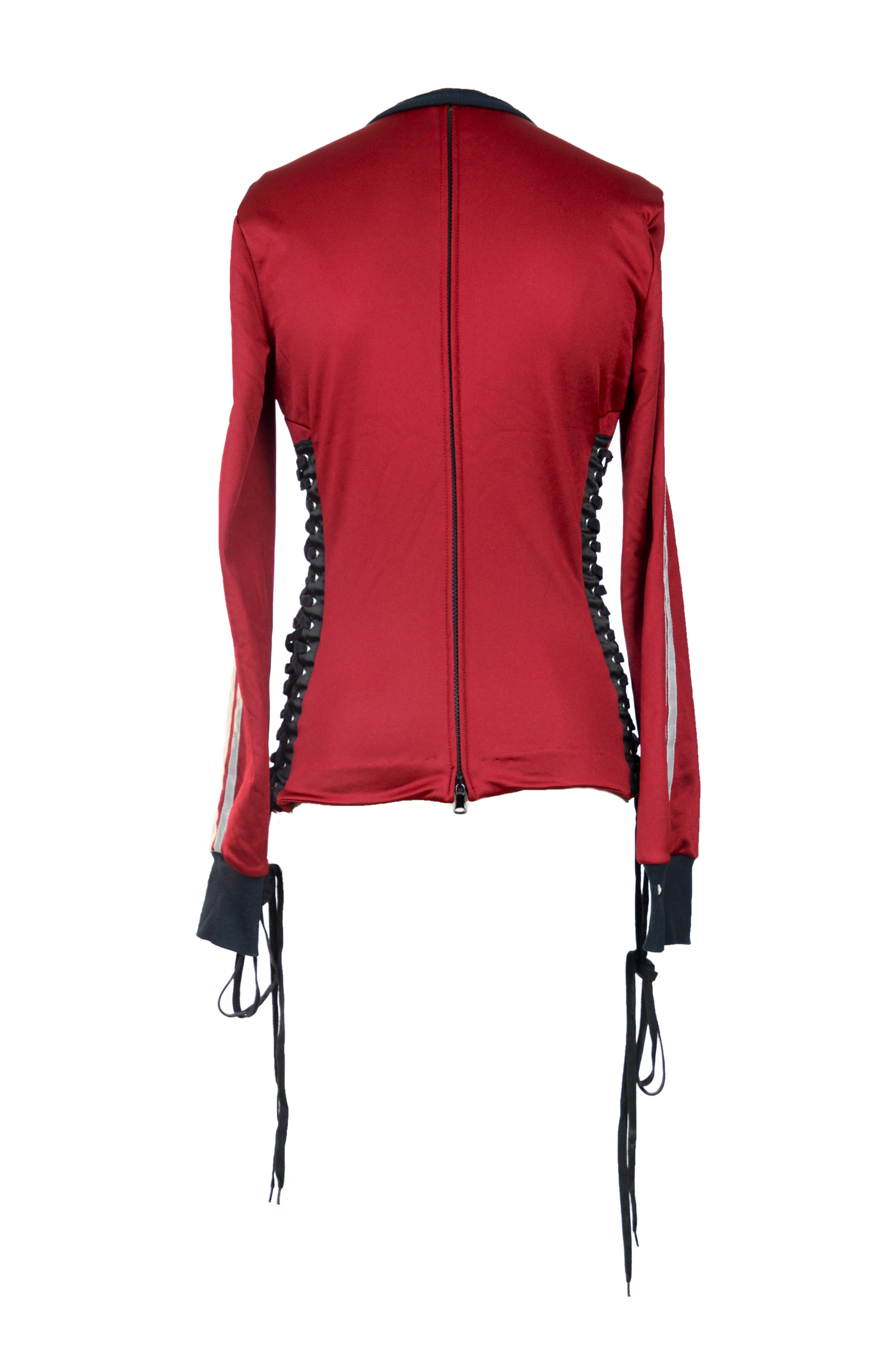 Felpa tecnica rossa con zip centrale, collo bomber e pannelli sagomati tipo corsetteria, con lacci stringati sui fianchi che permettono di regolare il punto vita.