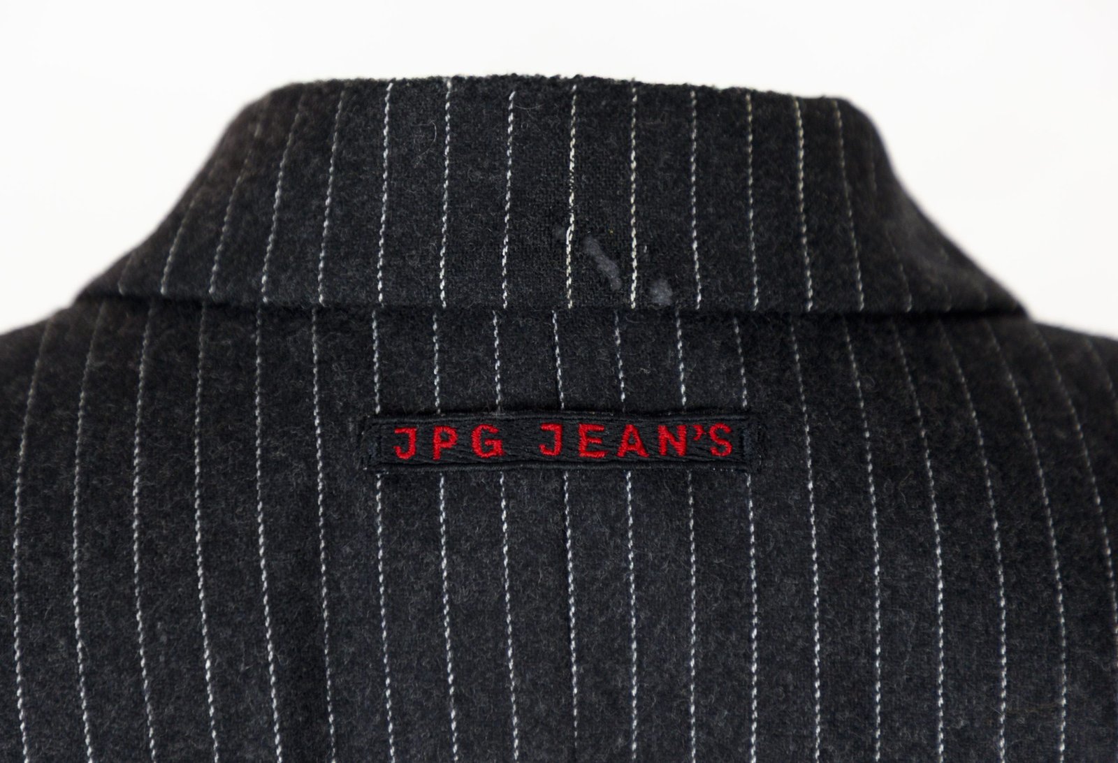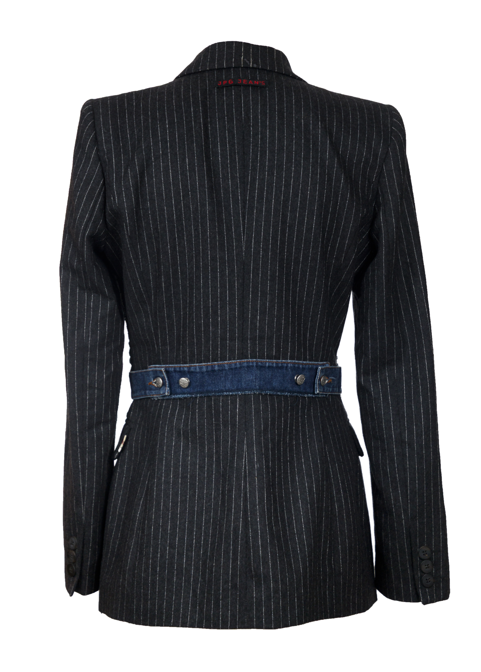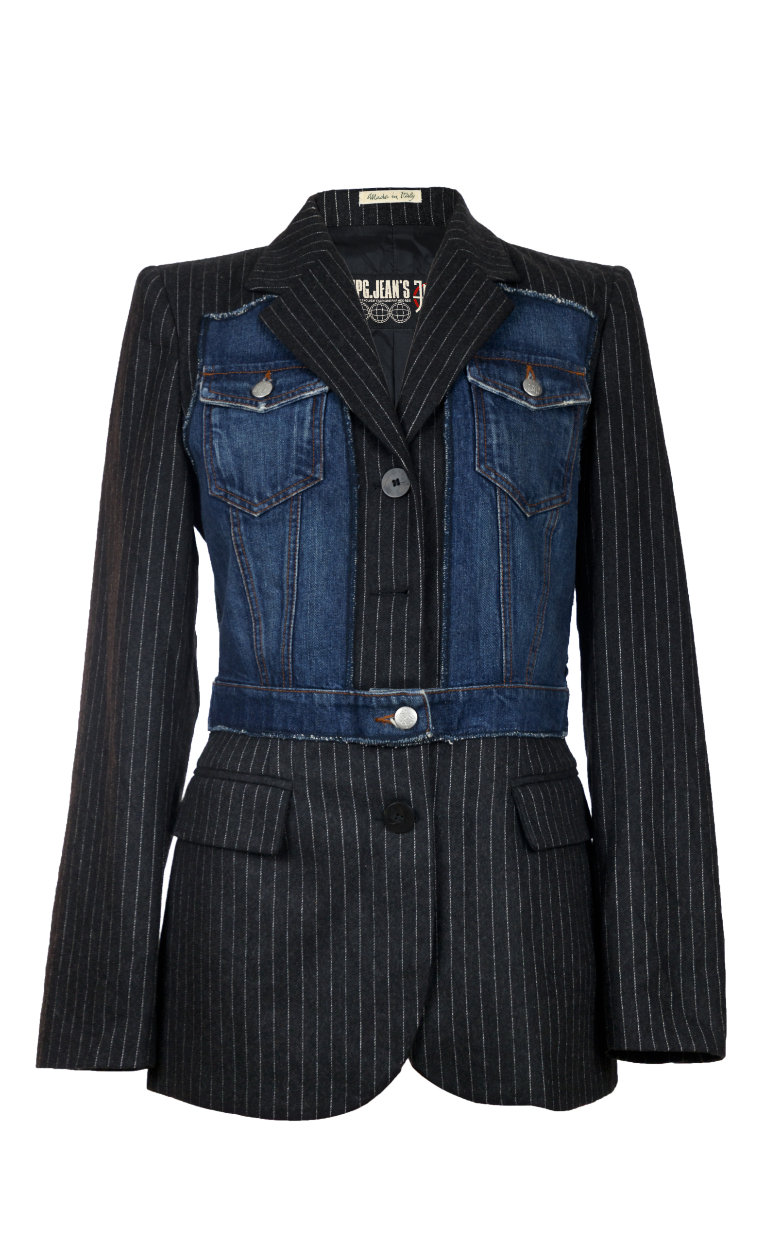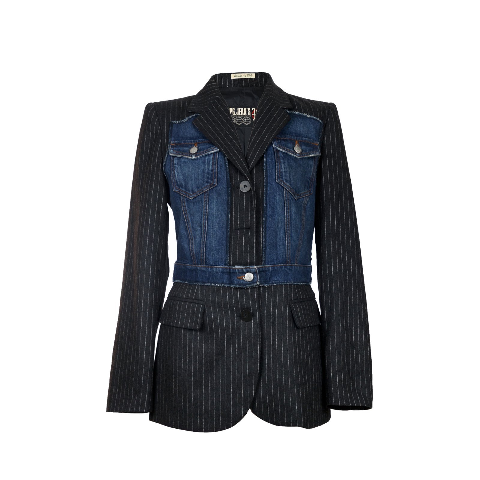 Giacca sartoriale a righe gessate con inserto frontale in denim blu: un ibrido tipico di Gaultier, che unisce tailoring classico e workwear in un solo pezzo. La costruzione è quella di un blazer monopetto, ma il pannello centrale richiama un gilet di jeans completo di taschini con pattina e cuciture a contrasto. Linea unisex del brand che proponeva gli stessi capi per uomini e donne