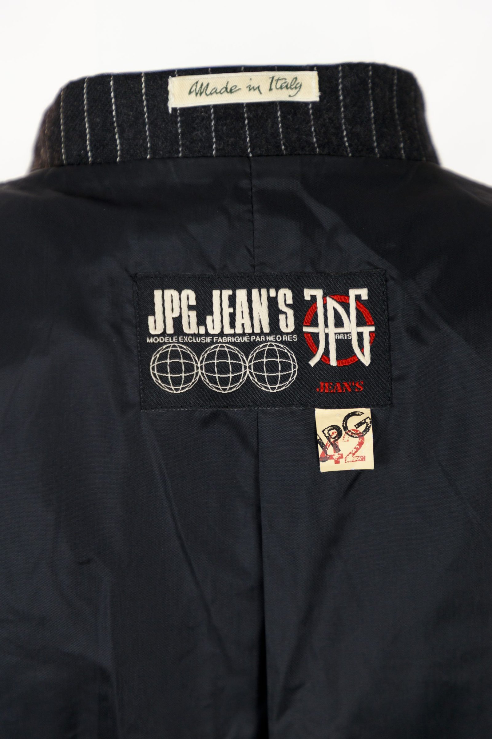 Etichetta interna “JPG JEAN’S” con globi e marchio JPG, taglia 42; “Made in Italy
