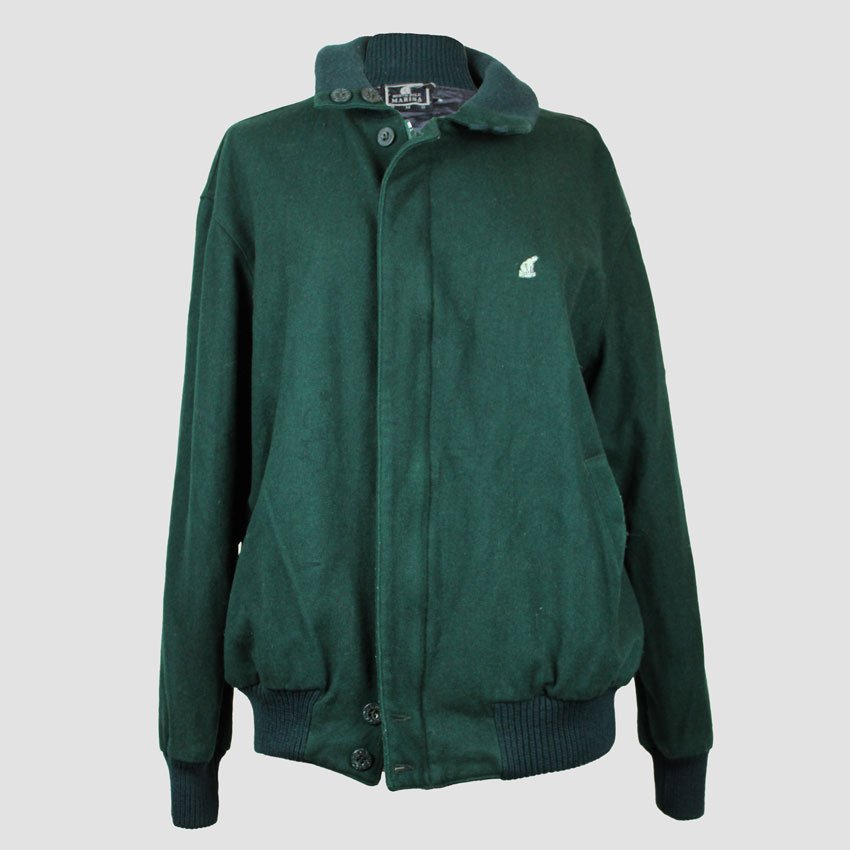 Giacca bomber North Pole Marina in gabardine verde bosco resistente, zip centrale metallica, collo rialzato, polsini e fondo vita a costine elastiche stretch che mantengono la forma dopo lavaggi.Ricamo orso bianco. Anni ’80 nautical style ispirato alla Costa Azzurra, con tasche laterali a zip sicure per telefono e chiavi, tasca interna porta-documenti e cuciture termosaldate per impermeabilità leggera; vestibilità regular che lascia spazio generoso per layering con maglie o camicie, quel tono verde navy profondo che vira leggermente sotto luce naturale, ideale su jeans slim o pantaloni fluidi in lino per giornate ventose,  o transizioni primaverili/autunnali, un pezzo funzionale che resiste all’usura quotidiana con lavaggio delicato a 30°C rovescio.