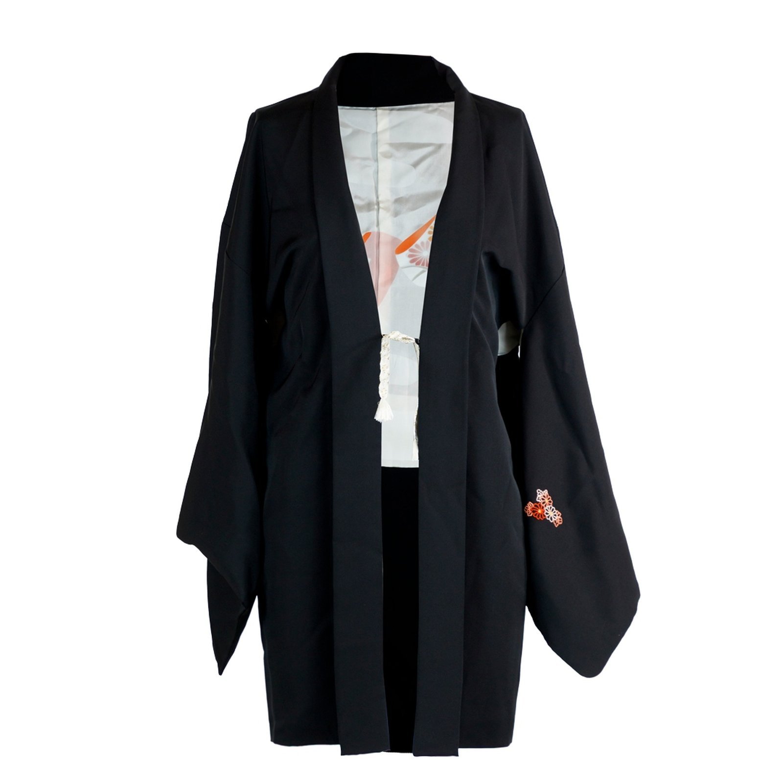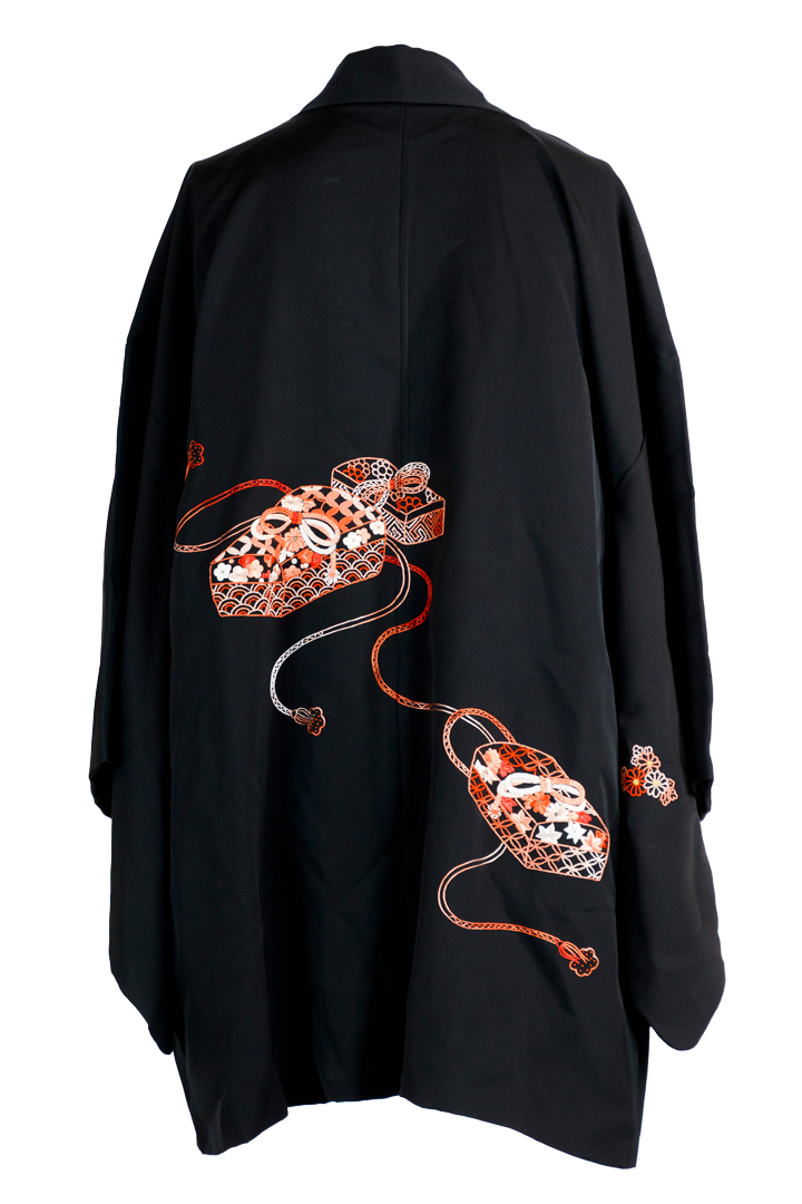 Raffinato haori giapponese da donna in pura seta nera, impreziosito da un elaborato ricamo raffigurante dei kinchaku, i sacchetti tradizionali giapponesi. Il motivo e simbolo di grazia, protezione e abbondanza.