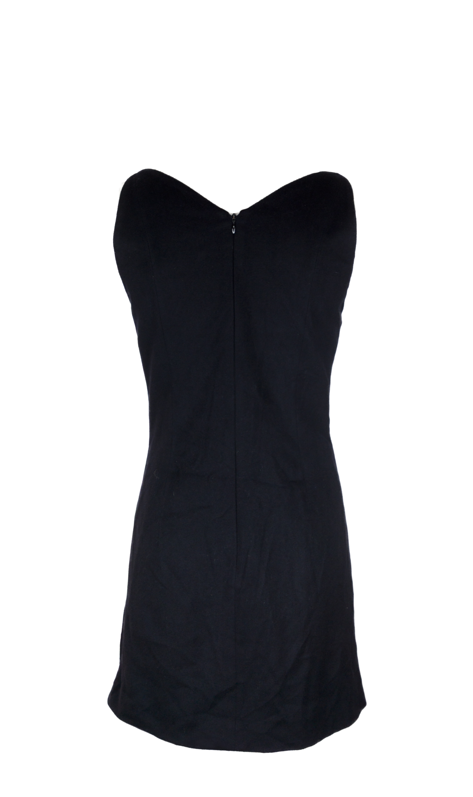 Abito corto in pura lana nera, linea pulita con scollo a cuore morbido e spalle scoperte, costruito con pannelli che seguono la figura senza stringere.