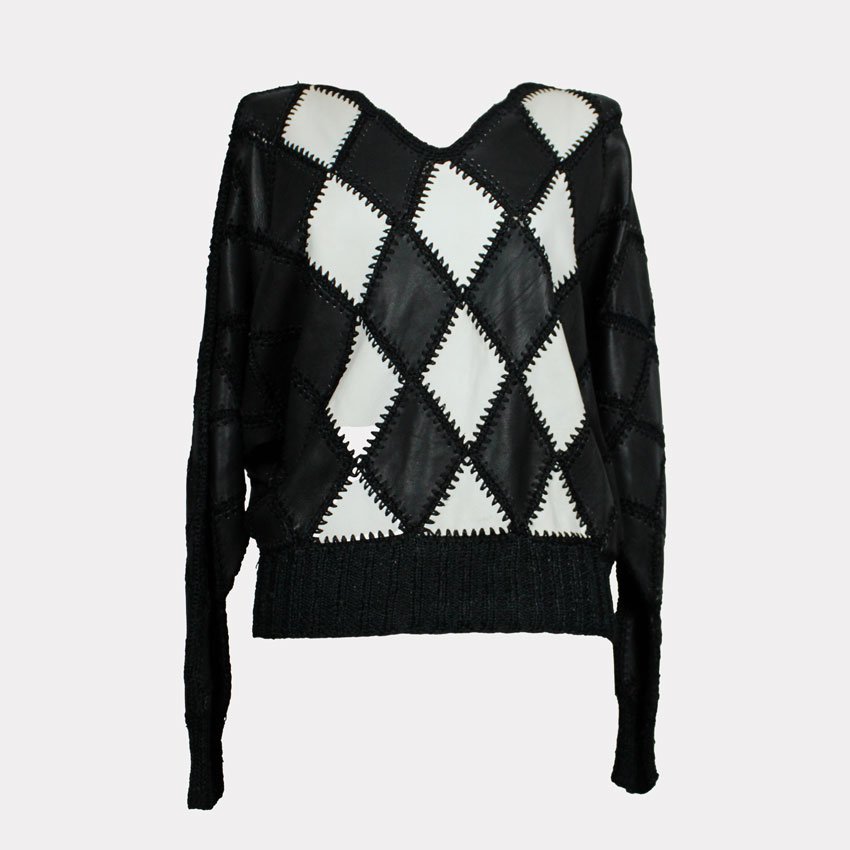 Maglia harlequin anni ’80, base in maglieria nera con tutti i rombi applicati in vera pelle (nero e bianco, tagliati e cuciti per mosaico geometrico), spalle con padding leggero per silhouette power-shoulder tipica dell’era.