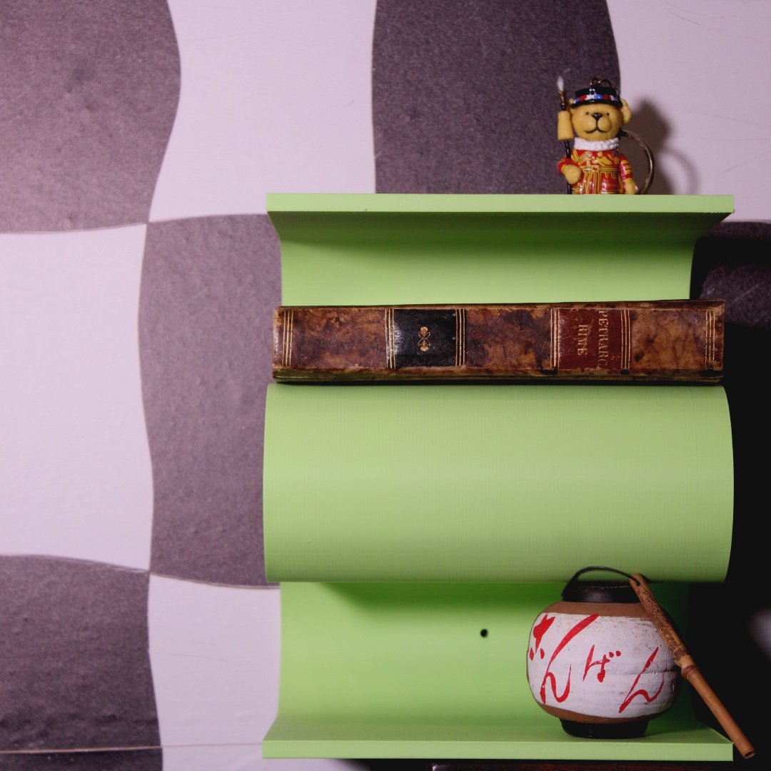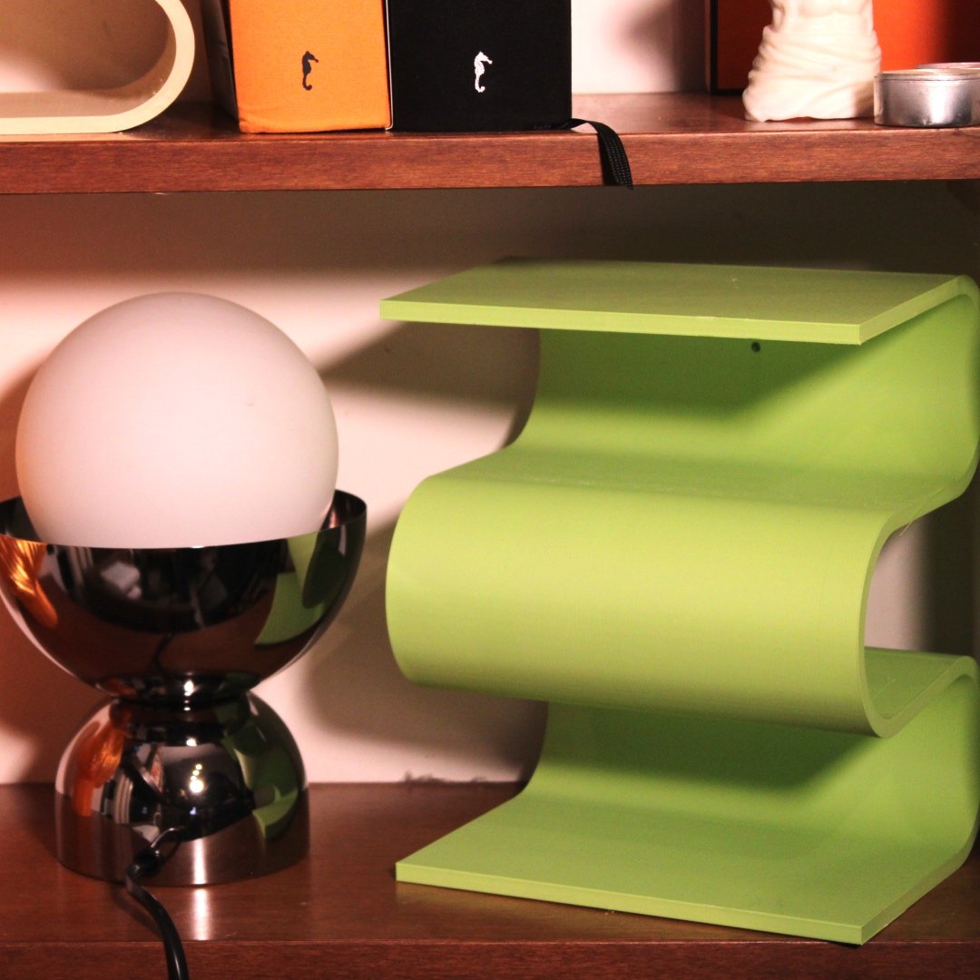 Mensola modulare stampata in 3D dal profilo a doppia onda, finitura verde lime; predisposizione posteriore con fori per fissaggio a parete.