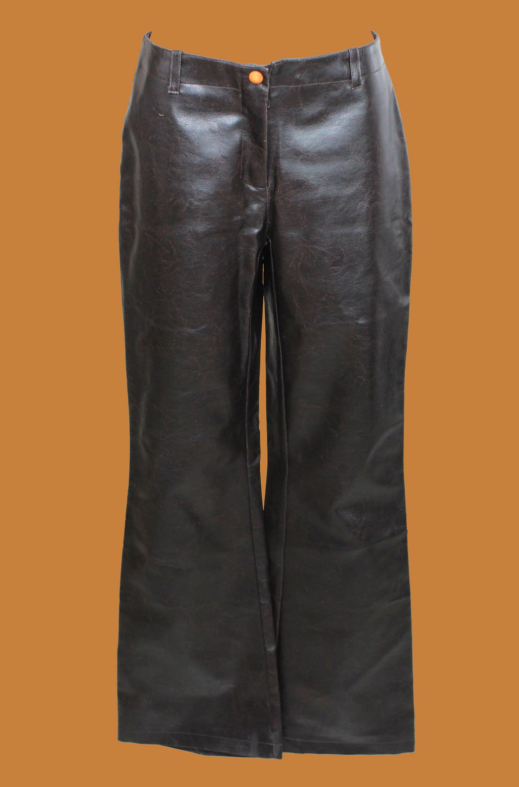 Pantaloni marroni, bottone arancione