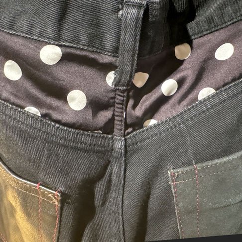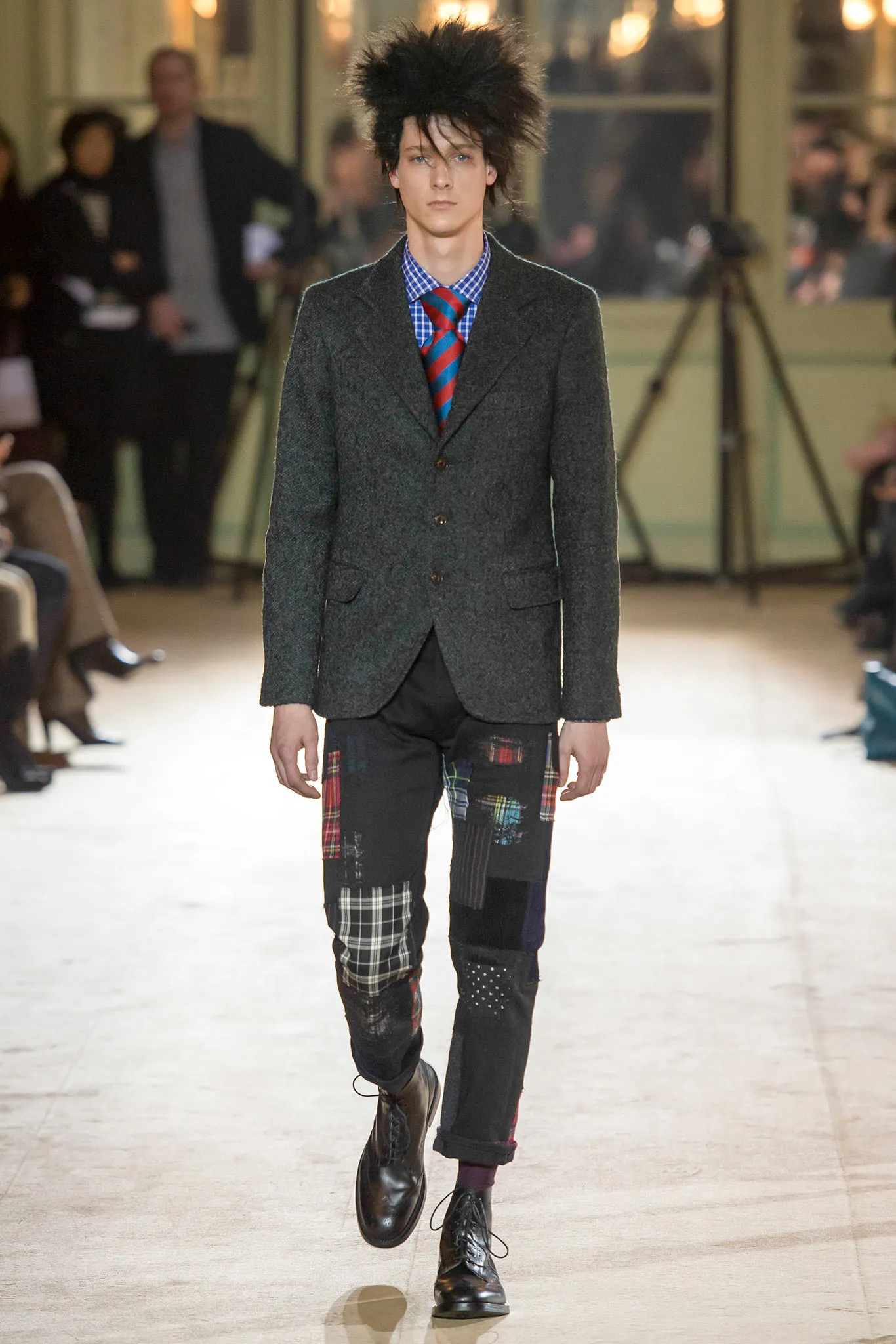Mostrata in una villa su Avenue Foch, un luogo più elevato del solito, la collezione di Watanabe era una lettera d’amore a Londra, tipicamente idiosincratica. Le acconciature hanno celebrato i culti giovanili della città: Teddy boy ducktail, Mod crop, glam rocker’s mullet, punk mohawk. La metà superiore di ogni vestito era un archetipo britannico. Outfit numero uno: il gentiluomo della città con il suo cappello a coda, la giacca di flanella grigia, la striscia dell’uomo d’affari e la cravatta. Metà inferiore, i jeans patchwork che sono stati una tale sensazione nella linea femminile di Junya che, riferisce Dover Street Market, anche gli uomini li hanno comprati.