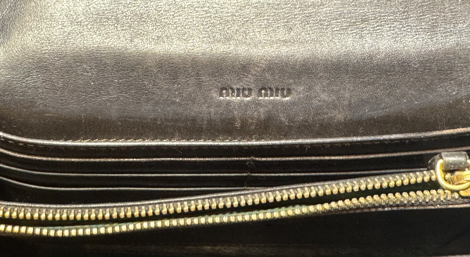 La marcatura interna a secco “miu miu” su pelle e la placca/logo frontale sono coerenti con i portafogli/clutch Miu Miu dei primi anni 2000, spesso realizzati in Italia con finiture lucide e stampe rettile