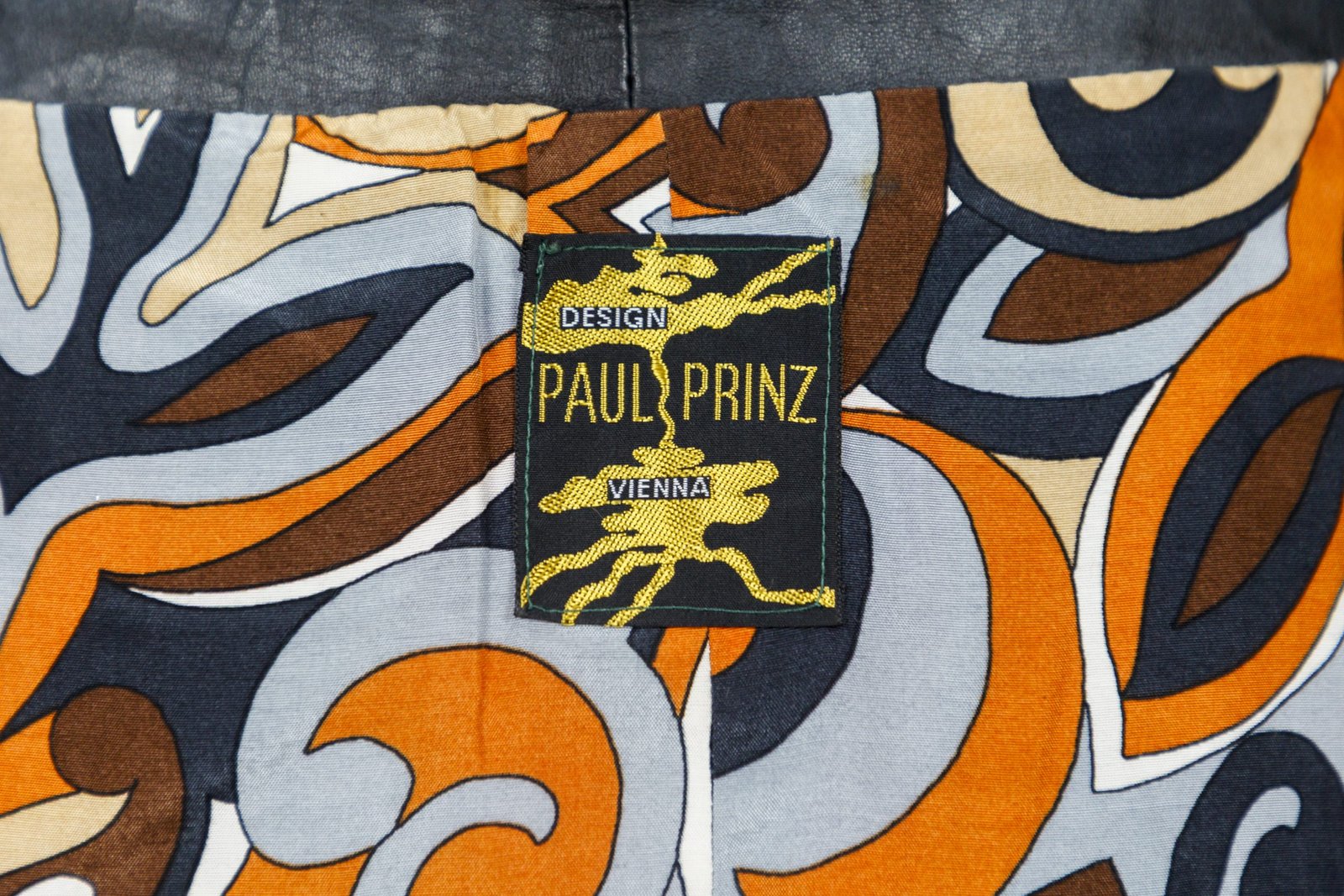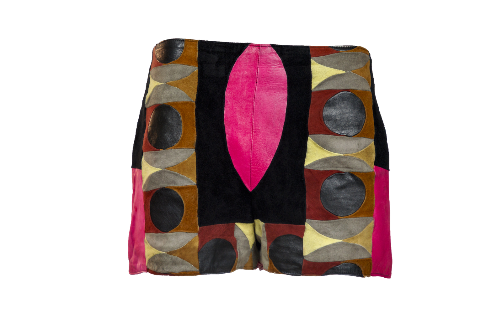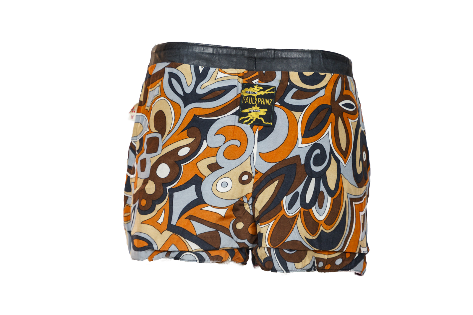Shorts vintage in pelle patchwork multicolore, costruiti con inserti a cerchi e spicchi su base scamosciata nera e pannelli in pelle liscia,Interno foderato con tessuto stampato dai toni arancio‑azzurro, etichetta “DESIGN PAUL PRINZ VIENNA” ricamata in giallo su fondo nero con sagoma grafica, tipica della produzione creativa viennese.