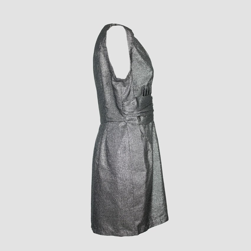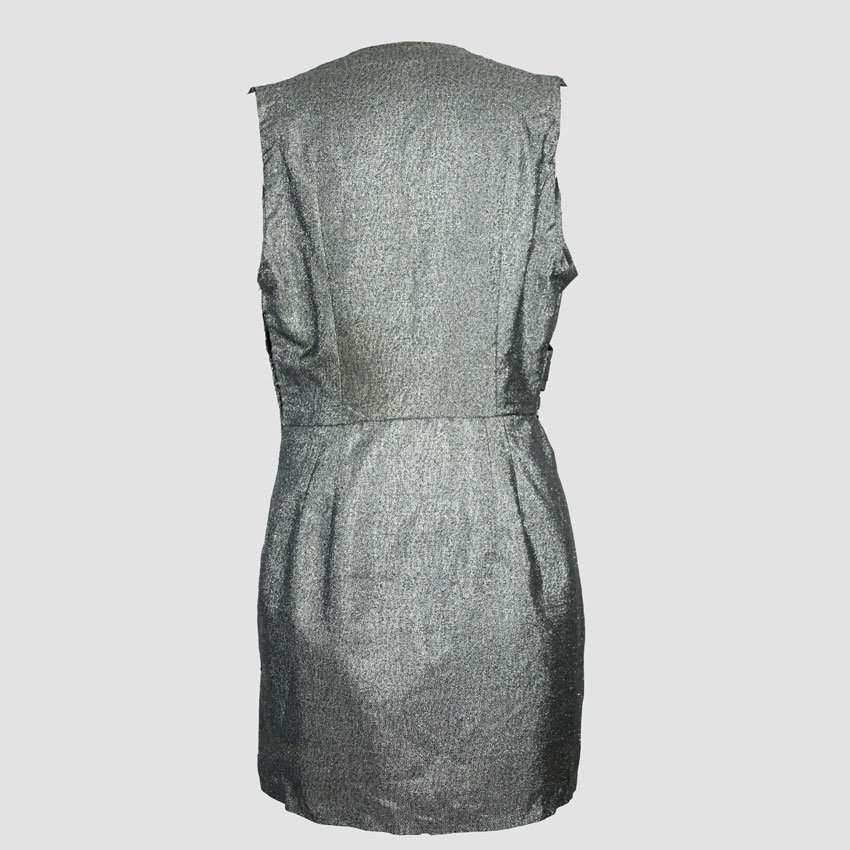 Vestito tubino mini in lamé metallizzato argento shimmering cangiante, sleeveless con scollatura V profonda asimmetrica profilata, parte superiore drappeggiata plissettata a pinces con allacciatura centrale a tre bottoncini piccoli tonali, gonna dritta leggermente svasata mini-lunghezza. Anni ’60 sartoriale, cocktail, zip dorsale invisibile corta con tiretto discreto, fodera interna minimal per comfort su pelle; silhouette bodycon flattering, iconico per serate evento, party o clubbing con kitten heels nude o clutch lucida minimal, lucentezza liquid-metal che riflette luci ambiente, dry-clean solo evitando umidità per mantenere lo sparkle originale